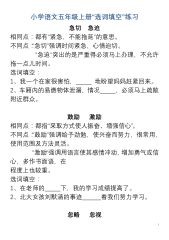 1小学语文五年级上册“选词填空”练习急切急迫相同点:都有“紧急,不能拖延”的意思。不同点:“急切”强调时间紧急,心情迫切。“急迫“突出的是严重得必须马上办理,不允许拖一点儿时间。选词填空:1、我一个在家很害怕,地盼望妈妈赶紧回来。2、车厢内的易燃物体泄漏,情况,必须马上疏散附近群众。鼓励激励相同点:都指“采取方式使人振奋、增强信心”。不同点:“鼓励”强调给予劲勉,使兴奋而努力,很常用,使用范围及方法灵活。“激励“强调用语言使其感情冲动,增加勇气或信心,多作书面语,在程度上也较重。选词填空:1、在老师的下,我的学习成绩提高了。2、北大女孩刘默涵的事迹着我们努力学习。忽略忽视2相同点:都有“应该考...