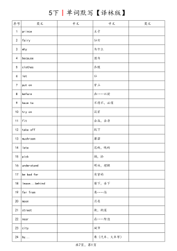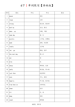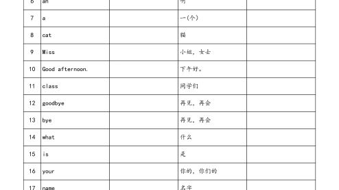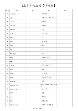 3上丨单词默写【译林版】序号英文中文中文英文1hello哈啰,你好2hi喂,嗨3Goodmorning.早上好。4I我5am是6ah啊7a一(个)8cat猫9Miss小姐,女士10Goodafternoon.下午好。11class同学们12goodbye再见,再会13bye再见,再会14what什么15is是16your你的,你们的17name名字18my我的19Nicetomeetyou!很高兴认识你!20too也21boy男孩22and和,与23girl女孩24Mr(AmEMr.)先生共6页,第1页序号英文中文中文英文25are是26you你,你们27no不,不是28not不,没有29ye...