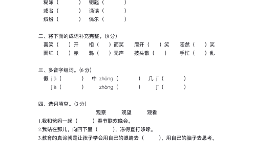 第1⻚三年级语⽂(上)三年级语⽂(上)三年级语⽂(上)期中测试卷期中测试卷期中测试卷AAA(考试时间:90分钟满分:100分)第⼀部分基础知识(45分)⼀、给下⾯的词语注⾳。(8分)摔跤()⼤坝()糊涂()钥匙()或者()诵读()缤纷()偶尔()⼆、将下⾯的成语补充完整。(8分)喜笑()开相()⽽笑眉开()笑哑然()笑⾯红()⾚鸦()⽆声披头散()⼿忙()乱三、多⾳字组词。(6分)假jiǎ()中zhōng()⼏jī()jià()zhòng()jǐ()四、选词填空。(3分)观察观望观看1.我和爸妈⼀起()春节联欢晚会。2.我站在那⼉,向四下⾥(),冻得直打哆嗦。3.教育的真谛就是让孩⼦学会⽤⾃⼰...