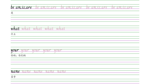 3上丨英语字帖【外研丨孙有中】班级:____________姓名:____________hihihihihi嘿,喂,你好IIIII我be(am,is,are)be(am,is,are)be(am,is,are)be(am,is,are)be(am,is,are)是whatwhatwhatwhatwhat什么youryouryouryouryour你的;你们的namenamenamenamename名字hellohellohellohellohello喂,哈啰,你好mymymymymy我的1/24goodbyegoodbyegoodbyegoodbyegoodbye再见havehavehave...