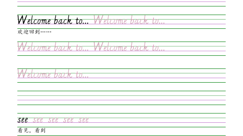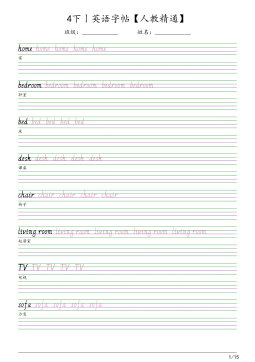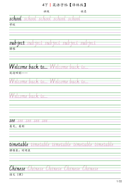 4下丨英语字帖【译林版】班级姓名schoolschoolschoolschoolschool学校subjectsubjectsubjectsubjectsubject课程Welcomebackto...Welcomebackto...Welcomebackto...Welcomebackto...Welcomebackto...欢迎回到……seeseeseeseesee看见,看到timetabletimetabletimetabletimetabletimetable课程表;时间表ChineseChineseChineseChineseChinese语文(课)1/22MathsMathsMat...