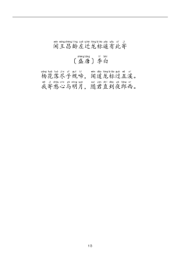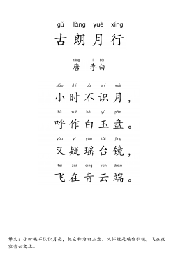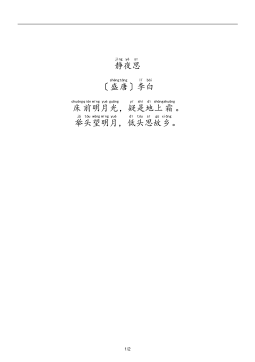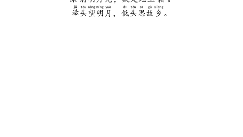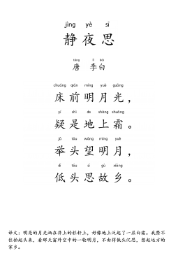 静jìng夜yè思sī〔盛shèng唐táng〕李lǐ白bái床chuáng前qián明míng月yuè光guāng,疑yí是shì地dì上shàng霜shuāng。举jǔ头tóu望wàng明míng月yuè,低dī头tóu思sī故gù乡xiāng。1/2静夜思〔盛唐〕李白床前明月光,疑是地上霜。举头望明月,低头思故乡。全文详解:〔注:静夜思:安静的夜晚产生的思绪。此诗《乐府诗集》卷九〇列入《新乐府辞》。〕床〔床:此字多有异议,今传五种说法。一说指井台;一说指井栏;一说是“窗”的通假字;一说坐卧的器具,此为本义;一说指胡床,古时一种可以折叠的轻便坐具,即“马扎”。〕前明月光,疑〔疑:好像。〕是...