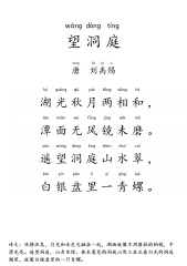 译文:风静浪息,月光和水色交融在一起,湖面就像不用磨拭的铜镜,平译文:风静浪息,月光和水色交融在一起,湖面就像不用磨拭的铜镜,平滑光亮。遥望洞庭,山青水绿,林木葱茏的洞庭山耸立在泛着白光的洞庭滑光亮。遥望洞庭,山青水绿,林木葱茏的洞庭山耸立在泛着白光的洞庭湖里,就像白银盘里的一只青螺。湖里,就像白银盘里的一只青螺。wng望dng洞tng庭tng唐li刘yǔ禹xī锡h湖guāng光qiū秋yu月liǎng两xiāng相h和,tn潭min面w无fēng风jng镜wi未m磨。yo遥wng望dng洞tng庭shān山shuǐ水cu翠,bi白yn银pn盘lǐ里...